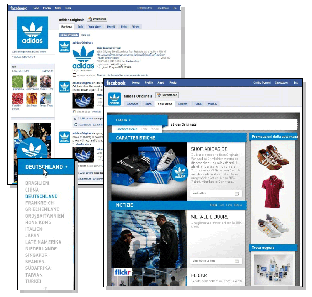 La page fan d’Adidas comprend une application „Your Area“ intégrée dans un onglet. Il faut souligner la possibilité de sélectionner la langue et le pays. Un point faible réside dans le fait que toutes les fonctionnalités mènent en dehors de facebook, sur la page web externe d’Adidas. Ainsi, l’application en elle-même ne déclenche aucune viralité.