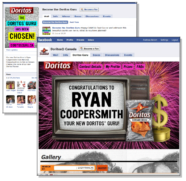 En janvier 2009, Doritos Chips Canada a lancé une campagne publicitaire très appréciée sur Facebook: intitulée „Become the Doritos Guru“, Doritos Chips Canada était à la recherche d’idée pour son propre marketing. Comme la récompense avait une valeur de 25.000 dollars américains, la campagne s’est diffusée rapidement et a généré presque 30 000 fans.